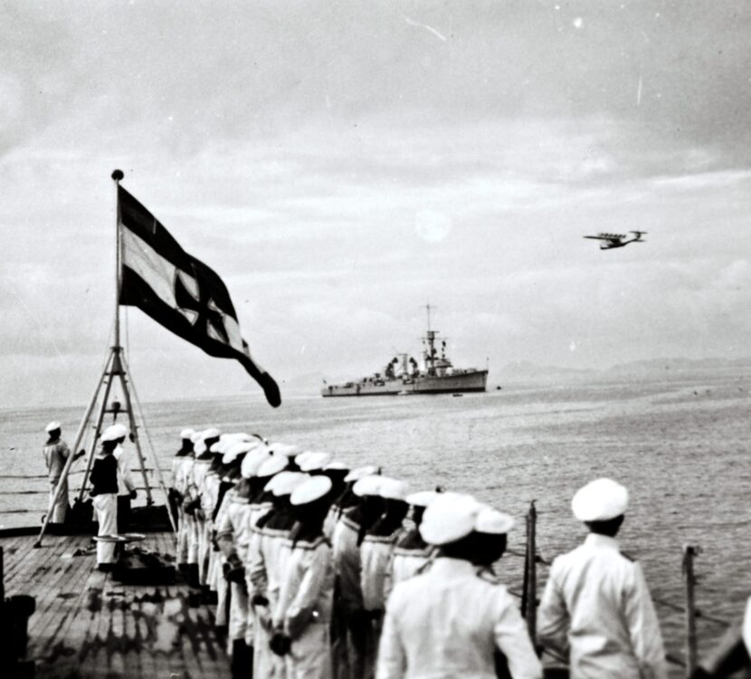 Cinco minutos más tarde voló el aparato sobre Vigo, sobrevolando la ciudad, descendiendo bastante al pasar sobre la ría, hasta casi rozar los cruceros alemanes anclados en la bahía, y cuyos marineros formados sobre cubierta saludaron al hidro y le vitorearon a la voz de mando, al tiempo que lanzaron bengalas, siendo contestados con saludos por los pasajeros del avión, desde el que también se lanzaron bengalas en respuesta a tan clamurosa bienvenida. El avión volvió a elevarse al cruzar sobre Cabo de Mar (a la altura de Alcabre), y así vieron miles de vigueses como sobrevolaba la ciudad el pájaro del aire.